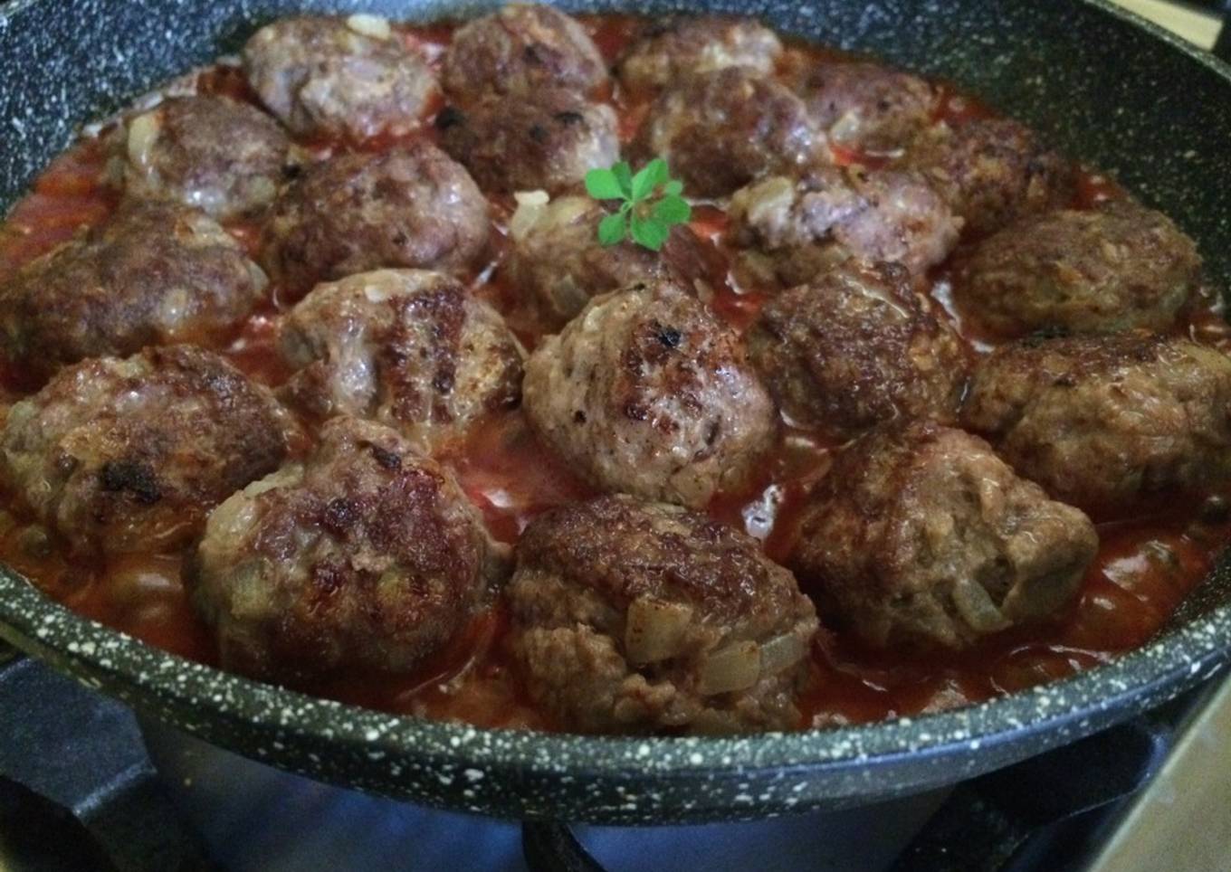 - Colocamos una tapa para que sellemos más rápido y retiramos después en un sartén aparte agregamos salsa de tomates y colocamos las albóndigas con un poquito de agua hervida y dejamos que tome el sabor de la carne y la salsa de tomate y listo dejamos unos 5 minutos a llama baja y empezamos a servir