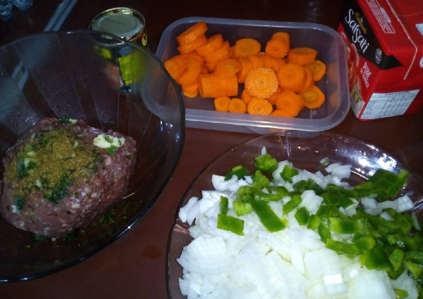 - Picar la cebolla, el morrón en cubito chiquito, cortar la zanahoria y las papas en rodajas y condimentar la carne con ajo perejil y comino