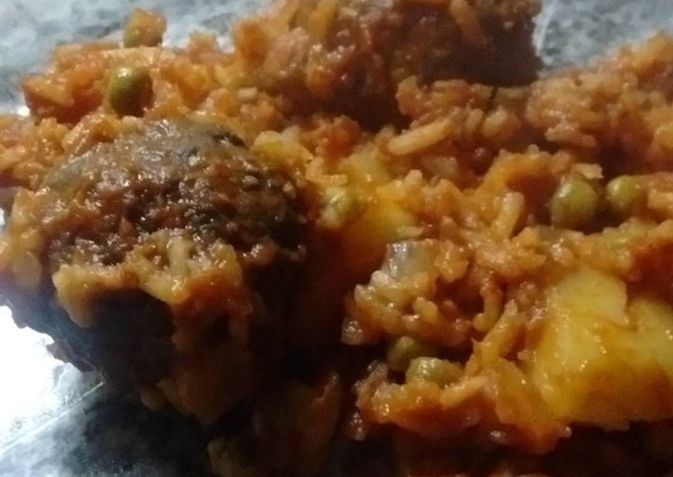 - Probamos y cuando les falta poco a las papas agregamos el arroz que tarda unos 12 minutos en estar listo. Previamente a este paso agregamos las albóndigas que teníamos reservadas.