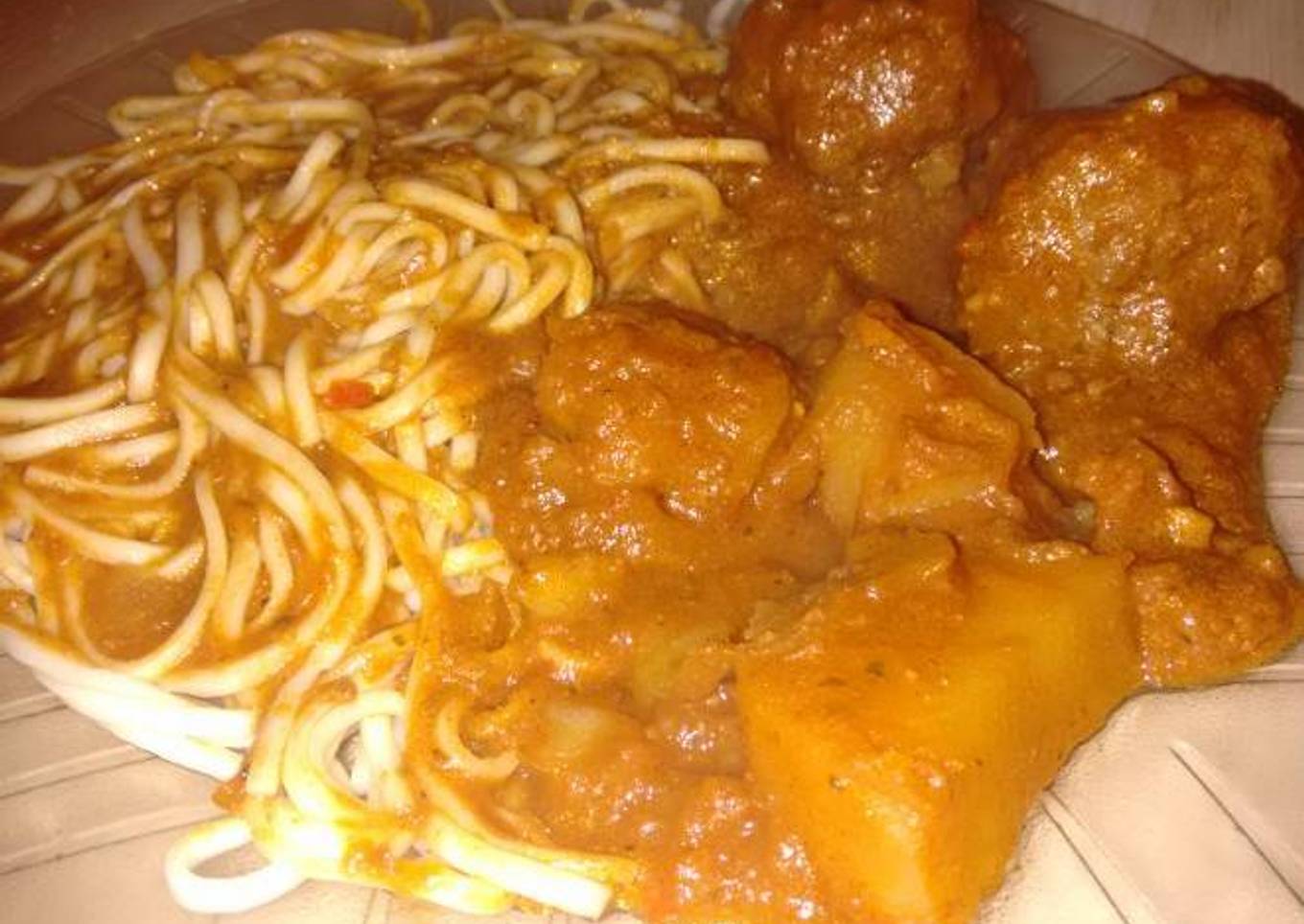 Albóndigas con tuco papa y fideos