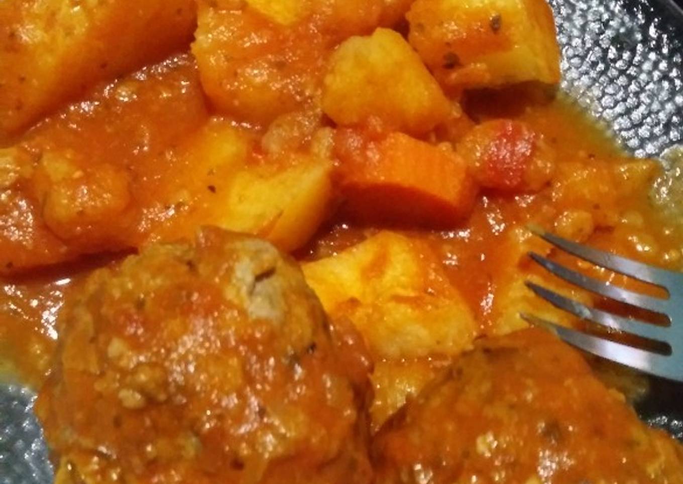 Estofado de albóndigas con papas y zapallo